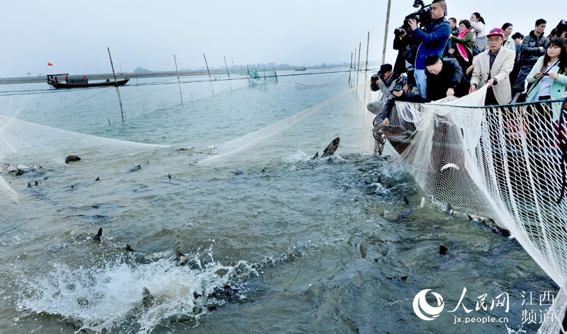 渔民正在收获今冬以来10万亩鄱阳湖内湖的第一张捕鱼大网,吸引了众多媒体记者和游客前来助阵。