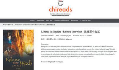 Chireads.com网站上的《放开那个女巫》的法语版介绍。Chireads.com由多名法国和中国网络文学爱好者共同成立,已与阅文集团合作,致力于中国网络文学在法语地区的海外传播。