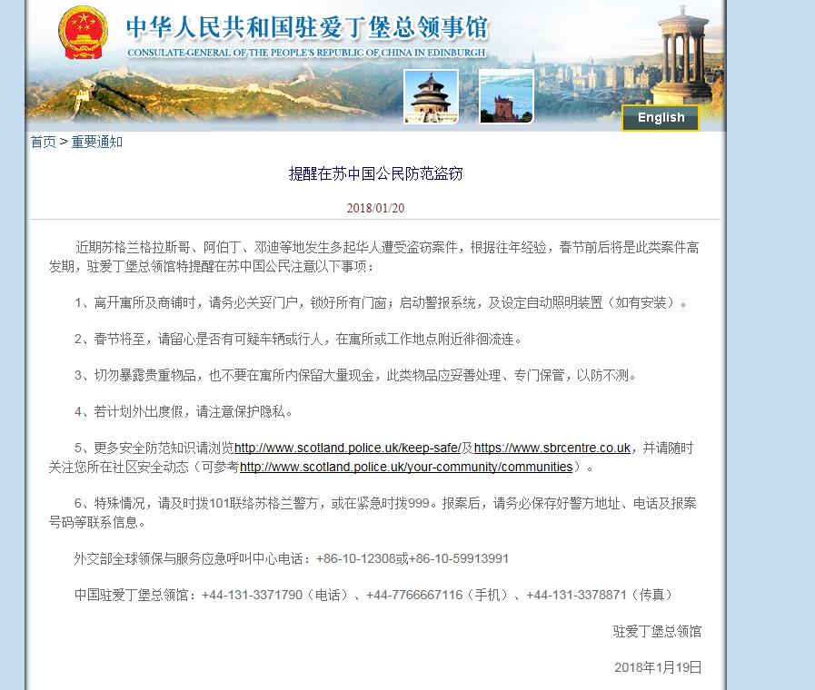 中国网/中国发展门户网讯 据中国驻英国爱丁堡总领事馆网站消息,近期苏格兰格拉斯哥、阿伯丁、邓迪等地发生多起华人遭受盗窃案件,根据往年经验,春节前后将是此类案件高发期,驻爱丁堡总领馆特提醒在苏中国公民注意以下事项: