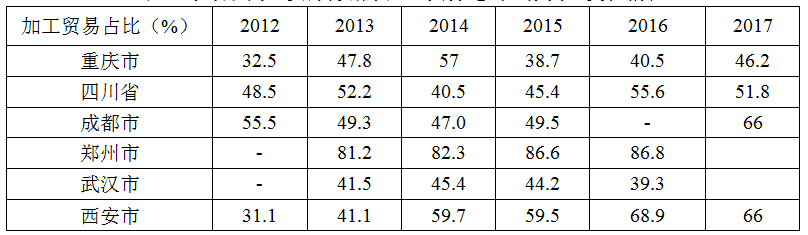 表2 中欧班列主要开行城市加工贸易进出口额占比变化情况