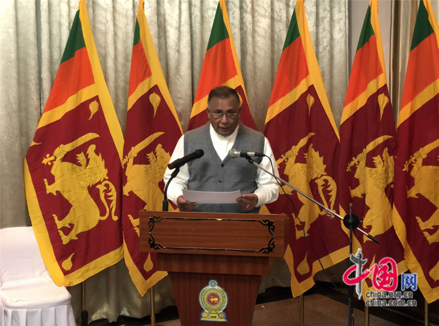 2月4日,斯里兰卡民主社会主义共和国独立70周年庆祝活动在斯里兰卡驻华大使馆举行,图为斯里兰卡驻华大使科迪图瓦库宣读斯里兰卡总统迈特里帕拉·西里塞纳的独立日贺词。