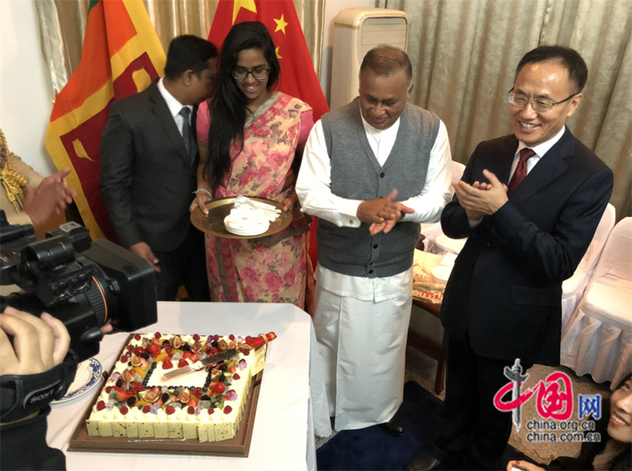 2月4日,斯里兰卡民主社会主义共和国独立70周年庆祝活动在斯里兰卡驻华大使馆举行,图为中国外交部部长助理陈晓东和斯里兰卡驻华大使科迪图瓦库共同切开庆祝斯里兰卡独立70周年的蛋糕。