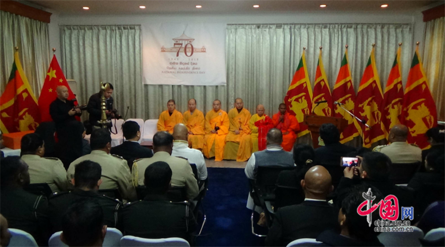 2月4日,斯里兰卡民主社会主义共和国独立70周年庆祝活动在斯里兰卡驻华大使馆举行。图为北京灵光寺高僧受邀为斯里兰卡独立日诵经祈福。