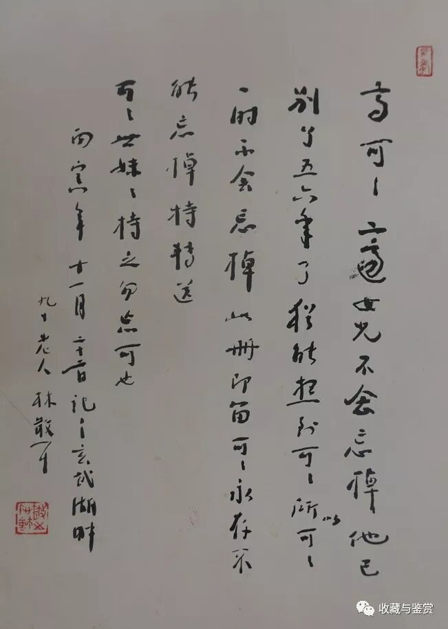 尹树人:1985年,《林散之书法选集》出版,在书的扉页上亲笔题写了一段十分悲伤的文字:“高可可二适女儿不会忘掉他已别了五六年了犹能想到可可所以可可一时不会忘掉此册即留可可永存不能忘掉特转送可可世妹妹持之勿忘可也丙寅年十一月二十二日记于玄武湖畔九十老人林散之。”原文没有标点符号,重复,多次重复,很不好理解。但是,一个中心思想十分明确:就是对高二适的深切怀念。