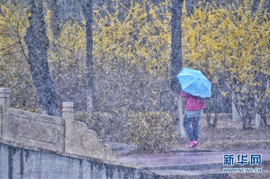 4月3日,市民在延庆区一个公园中赏雪。当日,华北中部地区气温骤降,位于燕山山脉脚下的北京市延庆区降下一场春雪。 新华社记者 李欣 摄