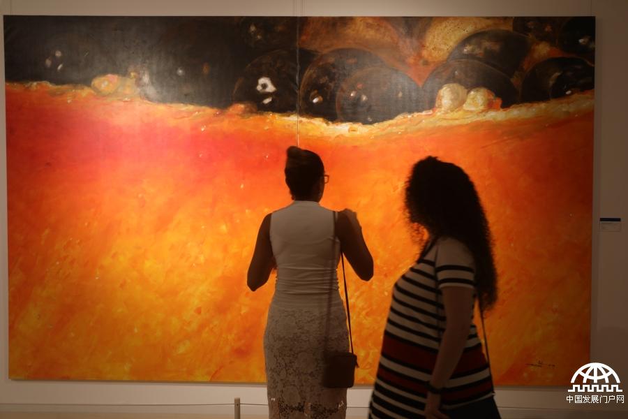 4月20日,“千里之行——古巴艺术展”在北京天桥艺术中心开幕,图为出席开幕式的嘉宾观赏艺术作品。