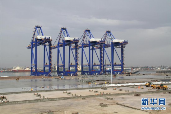 这是5月18日拍摄的纳米比亚沃尔维斯湾港集装箱码头的四台岸桥。中国港湾工程有限责任公司(中国港湾)在纳米比亚沃尔维斯湾港吹填了40万平方米的人工岛,为港口建设新集装箱码头。集装箱码头项目于2014年开工,全部建设内容包括600米长的集装箱码头泊位及其后方堆场、配套设施和372米长的邮轮码头,预计将于今年年底完工。项目建成后,沃尔维斯湾港年集装箱吞吐量将从现在的30万标箱提升至75万标箱。新华社记者吕天然摄