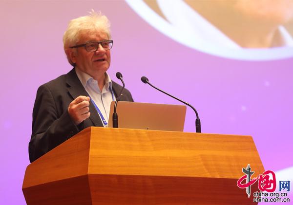 5月29日上午,中国科学院第十九次院士大会举行学部第六届学术年会首场全体院士学术报告会。图为中国科学院外籍院士、诺贝尔奖获得者詹姆斯·弗雷泽·司徒塔特作学术报告。王虔摄