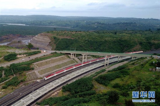 6月2日,列车在肯尼亚蒙内铁路上行驶(航拍照片)。