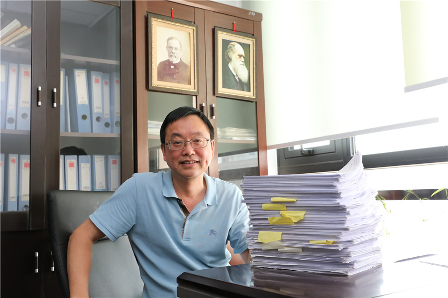 覃重军研究员与他的两千多页实验手稿。杨正行摄