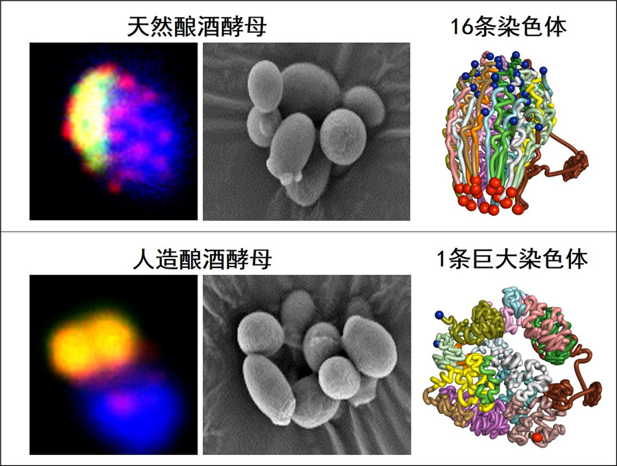 人造单染色体酵母与天然酵母细胞对比图,两者形态相似,但染色体的三维结构有巨大改变。中科院供图