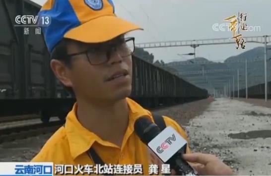 河口火车北站 调车长 段宇:“以前车站没建的时候一般都是靠汽车运输,运费这些方面都比较高。现在我们国家不是开启‘一带一路’把火车站建起来,进出口的货物用我们火车运输方便、快捷、安全,然后运费也不算太高,低碳环保 我们现在用电不烧油。”