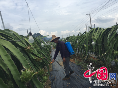 图为龙州县彩港火龙果种植示范基地内果农正在喷洒农药。中国网 殷晓霞摄