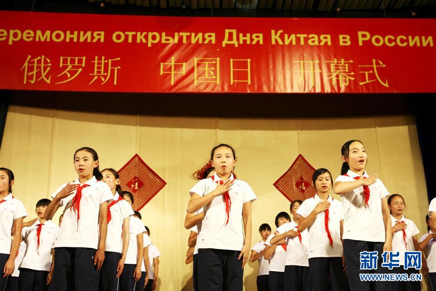 2008年7月27日,在位于符拉迪沃斯托克市郊区的“海洋”全俄儿童中心,孩子们在“中国日”开幕式上演唱《感恩的心》。 新华社记者郑悦摄