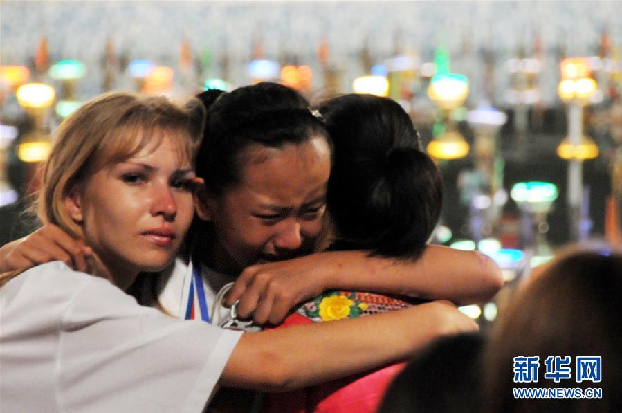 2009年8月11日,在位于符拉迪沃斯托克市郊区的“海洋”全俄儿童中心,即将结束疗养的中国地震灾区儿童与辅导员拥抱泪别。新华社记者海洋摄