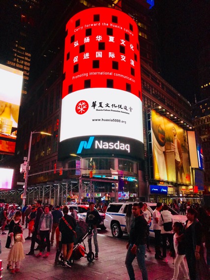 中国网/中国发展门户网讯 10月1日,美国纽约时代广场纳斯达克塔楼大屏上滚动播放了“弘扬华夏文化、促进国际交流”的“中国红”广告,路过的华人纷纷站在大屏广告下拍照留念。