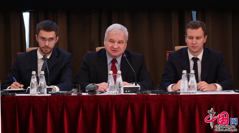 12月12日,俄罗斯联邦驻华大使馆在北京举行2018年度新闻发布会。图为俄罗斯驻华大使安德烈•杰尼索夫(中)介绍2018年中俄两国合作交流情况。中国网/王东海 摄