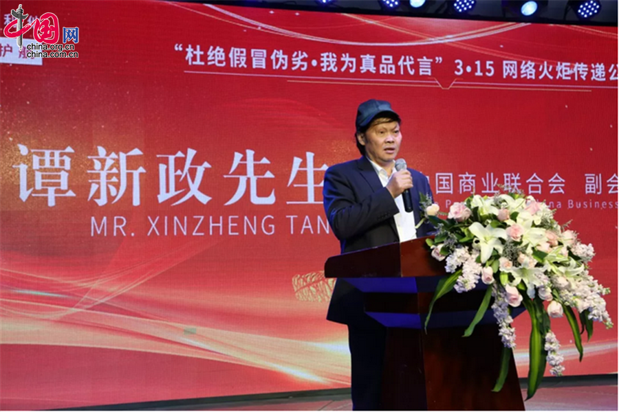 3月15日,“杜绝假冒伪劣,我为真品代言”3·15网络火炬传递公益活动在北京启动。图为中国商业联合会副会长谭新政演讲。杜添辉摄