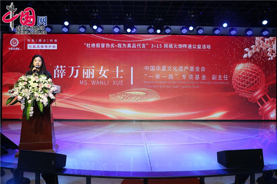 3月15日,“杜绝假冒伪劣,我为真品代言”3·15网络火炬传递公益活动在北京启动。图为中国华夏文化遗产基金会“一带一路”专项基金副主任、华夏未来传承(北京)非物质文化遗产保护有限公司董事长薛万丽演讲。杜添辉摄