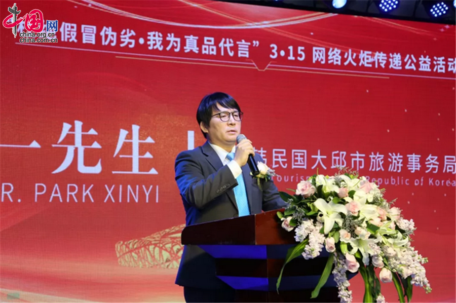 3月15日,“杜绝假冒伪劣,我为真品代言”3·15网络火炬传递公益活动在北京启动。图为韩国大邱市旅游事务局局长朴信一演讲。
