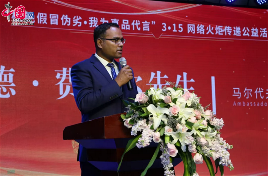 3月15日,“杜绝假冒伪劣,我为真品代言”3·15网络火炬传递公益活动在北京启动。图为马尔代夫驻华大使费萨尔·穆罕默德发表演讲。杜添辉摄
