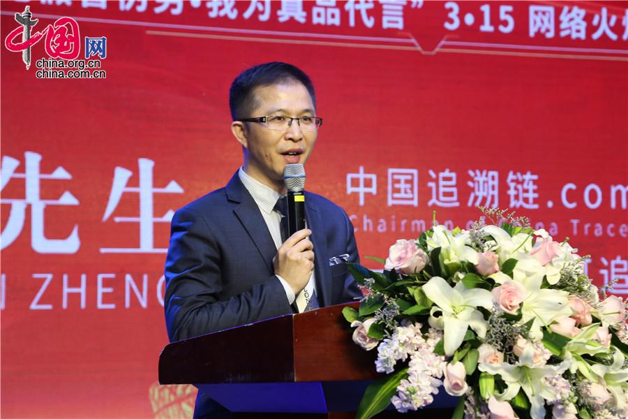 3月15日,“杜绝假冒伪劣,我为真品代言”3·15网络火炬传递公益活动在北京启动。图为中追溯源(北京)科技股份有限公司董事长、“一带一路”可追溯商品数据库项目负责人郑力维演讲。杜添辉摄