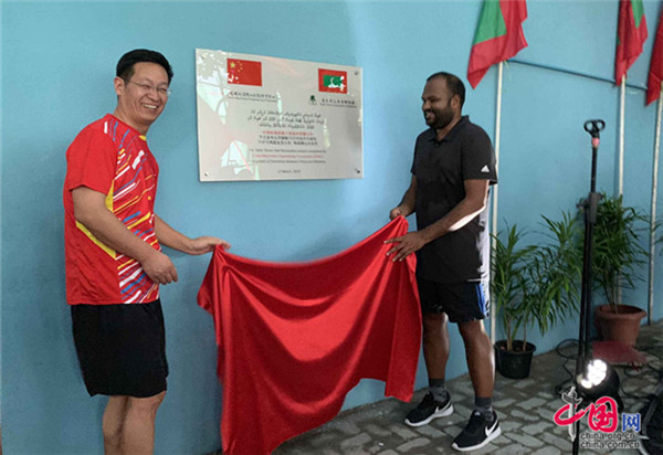 3月18日,马尔代夫乒乓球馆改造工程完工暨场馆启用仪式举行。图为中国驻马尔代夫大使张利忠(左)与马尔代夫旅游部长阿里·瓦希德为新场地揭牌。
