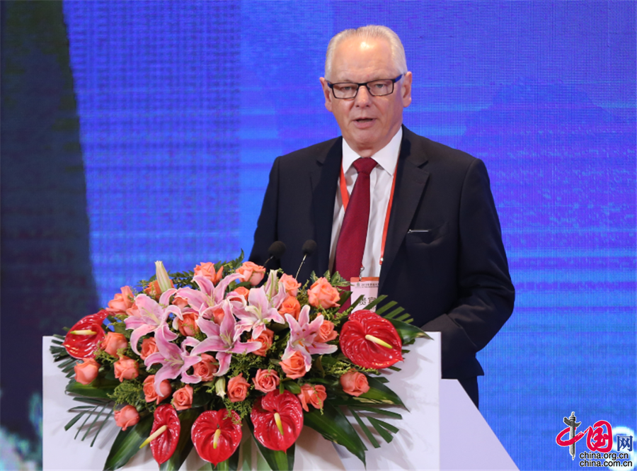 4月8日,2019世界新兴产业大会在河南省郑州市举行。图为英国贸易与投资前国务部长、内阁办公室前大臣弗朗西斯·麦浩德勋爵致开幕词。中国网 王东海摄