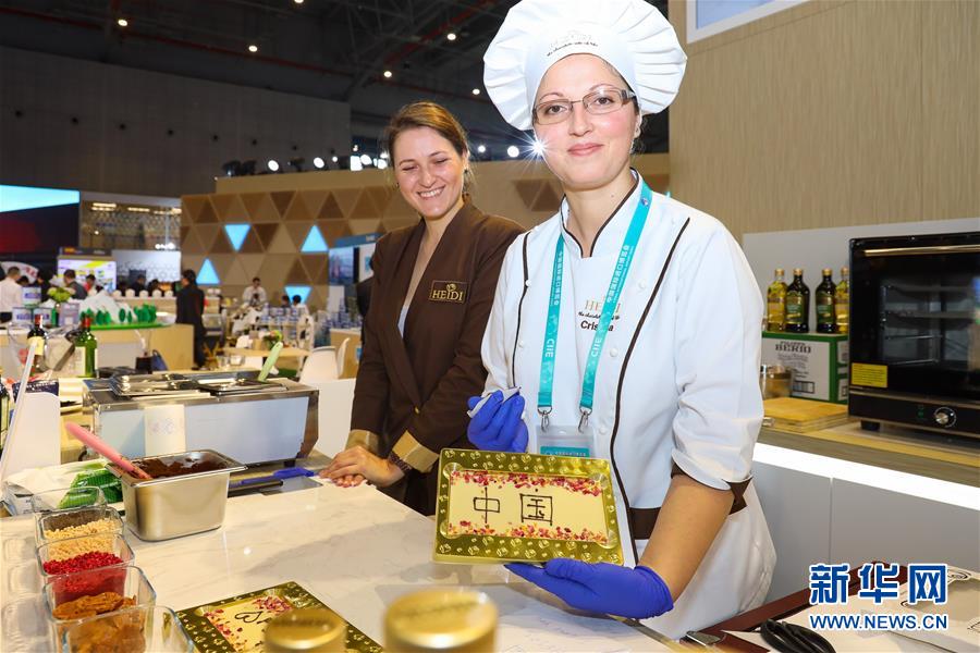 2018年11月7日,在上海进博会食品及农产品展区,瑞士Heidi巧克力品牌的甜点师为观众定制个性化巧克力。
