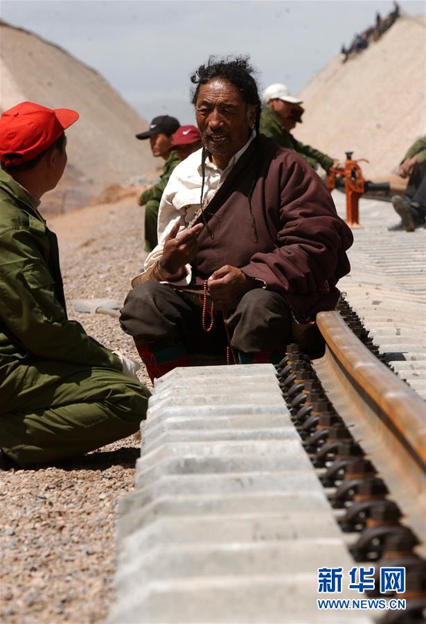 2004年6月20日,第一次见到铁轨的藏族群众与施工人员交谈。 新华社记者 觉果 摄