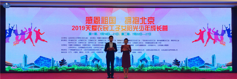 中国网/中国发展门户网讯 (杜添辉、实习记者王毅飞)7月17日,“感恩祖国·拥抱北京”—2019关爱农民工子女阳光少年成长营开营仪式在京举行,由全总农民工工作领导小组办公室主办,中国职工国际旅行社总社承办。来自全国12个省区市的1000多名农民工子女带着向新中国成立70周年的祝福启航梦想。全国总工会书记处书记曲昭伟出席开营仪式并为营员授旗。