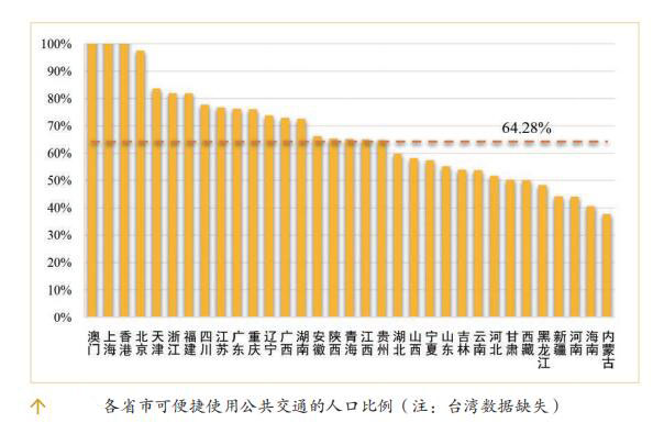 报告分析了中国地级市(除台湾之外)建成区公共交通站点 500 米范围内的人口覆盖比例。总体上,中国省级尺度可便捷使用公共交通的人口比例平均为64.28%,东部地区省份普遍高于中西部地区省份,南方省份普遍高于北方省份。其中,澳门、上海、香港达到100%,即距公共交通站点500米覆盖了建成区全部人口;北京、天津、浙江、福建、四川、江苏、广东、重庆、辽宁、广西、湖南、安徽、陕西、青海、江西、贵州等省市高于全国平均水平;低于全国平均水平的14个省份中,既有东部地区的山东、河北、海南,也有中部地区的湖北、山西、吉林、黑龙江、河南和西部地区的宁夏、云南、甘肃、西藏、新疆、内蒙古。