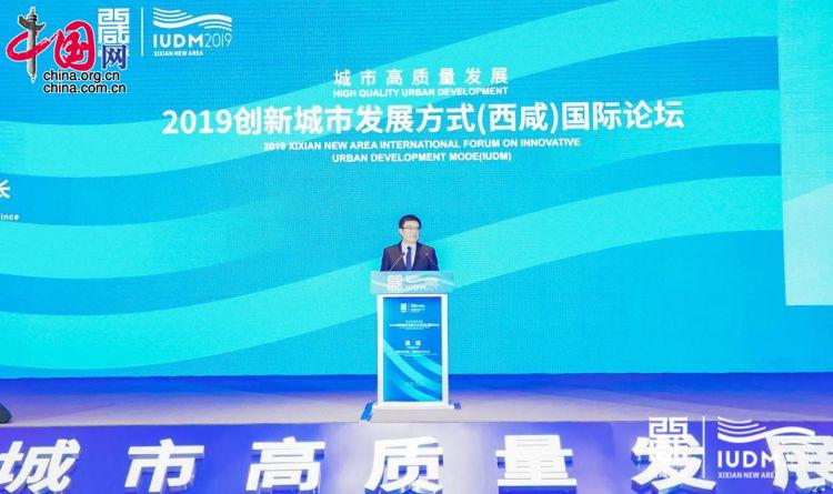 10月13日,2019创新城市发展方式(西咸)国际论坛在西咸新区举办。图为西安市政协主席、西咸新区党工委书记岳华峰发表演讲。