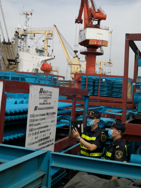 时值初夏,气温已升至32度,厚厚的云层堆积在江边,潮气混着热气,口罩被汗水贴在了脸上。日前,吴淞海关查检一科两名关员来到码头堆场,对一批用于电厂外围设施建设用的镀锌钢管等设备、构件进行查验。