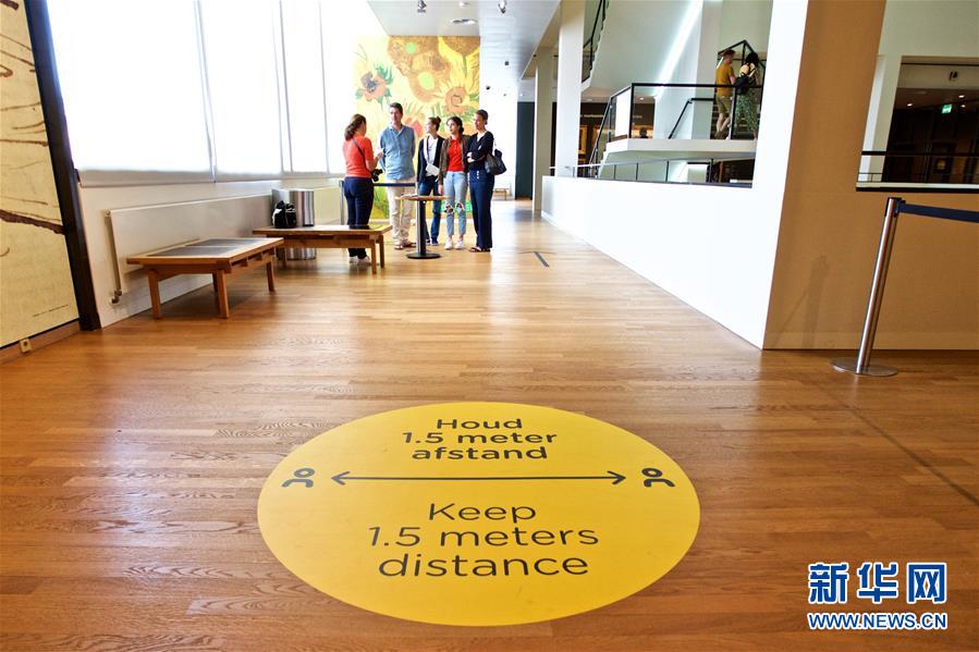 6月1日,在荷兰阿姆斯特丹,梵高博物馆的地面贴纸提醒观众保持社交距离。 新华社发(西尔维娅·莱德雷尔摄)