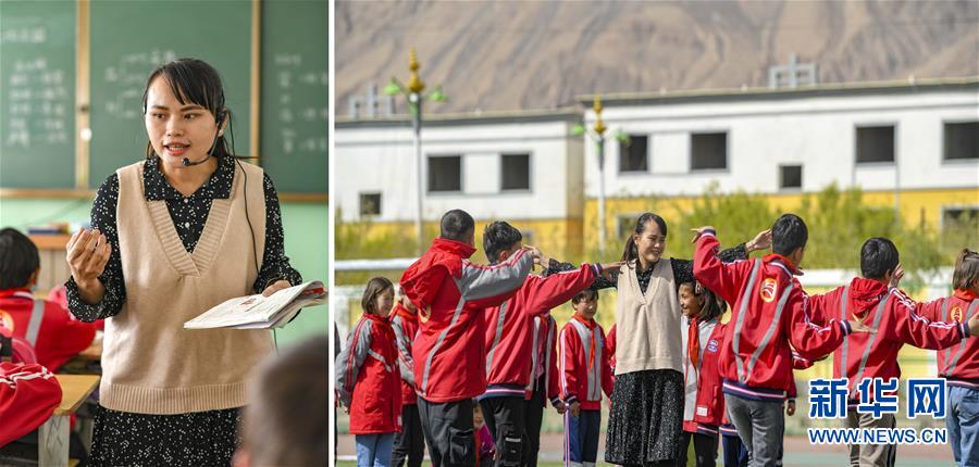 拼版照片:左图为来自三亚的周冰倩在新疆塔什库尔干塔吉克自治县城乡寄宿制小学讲课(6月4日摄);右图为周冰倩和学生们在课间一起跳舞(6月4日摄)。 新华社记者 胡虎虎 摄