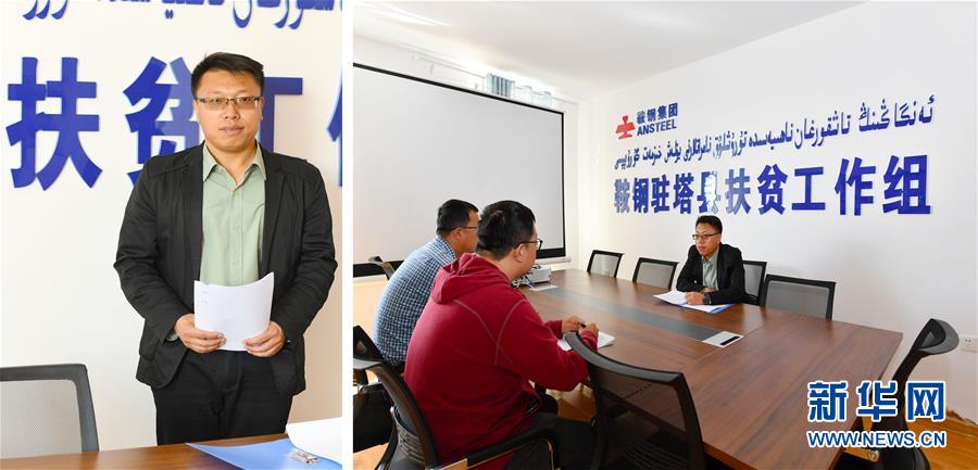 拼版照片:左图是在新疆塔什库尔干塔吉克自治县县城办公室拍摄的鞍钢集团援疆干部马荣材(6月11日摄);右图为马荣材(右)和鞍钢援疆工作人员一起讨论工作计划(6月11日摄)。新华社记者 胡虎虎 摄