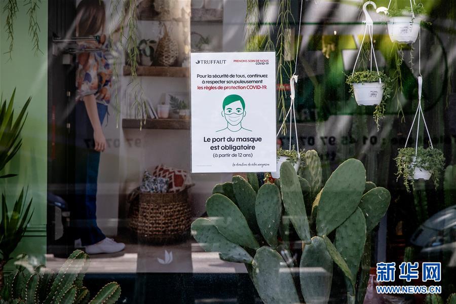 这是7月20日在法国巴黎一家商店拍摄的佩戴口罩提示。 新华社发(奥雷利安·莫里萨尔摄)