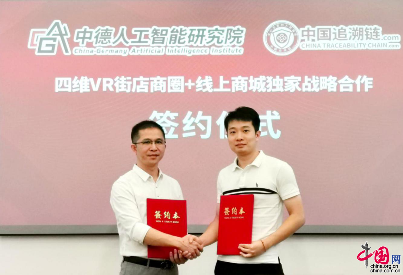 图为中国追溯链.com与中德人工智能研究院举行“四维VR街店商圈+线上商城”独家战略合作签约仪式。