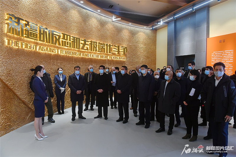3月30日,上海合作组织秘书长及有关国家驻华使节和外交官一行来疆参访代表团在新疆国际会展中心参观“新疆的反恐和去极端化斗争主题展”。记者 邹懿摄