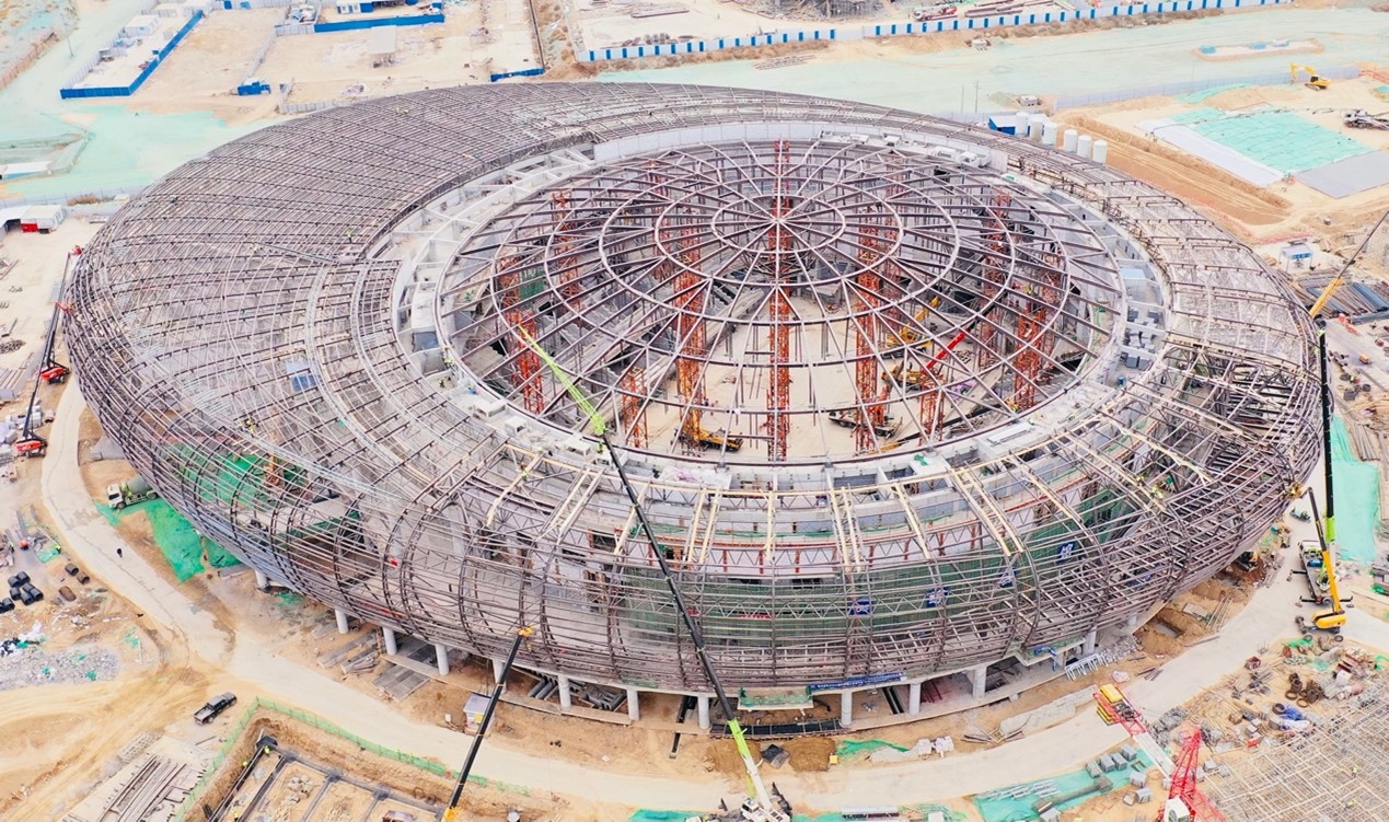 4月8日,兰州奥体中心综合馆钢结构罩棚全部安装完毕。