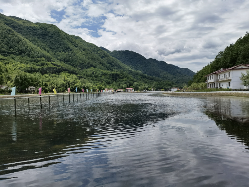 五月的秦岭南坡到处郁郁葱葱,从镇安县城沿着崭新的G345柏油路驱车一个多小时便进入西口回族镇一个叫程家川的地方。进沟后,沿路两边是正在盛开的大片芍药花,以及一排排红豆杉,前行约十分钟,映入眼帘的是一片接着一片的超大水面。很难想象在“九山半水半分田”的镇安县有这样一片奇特水域。