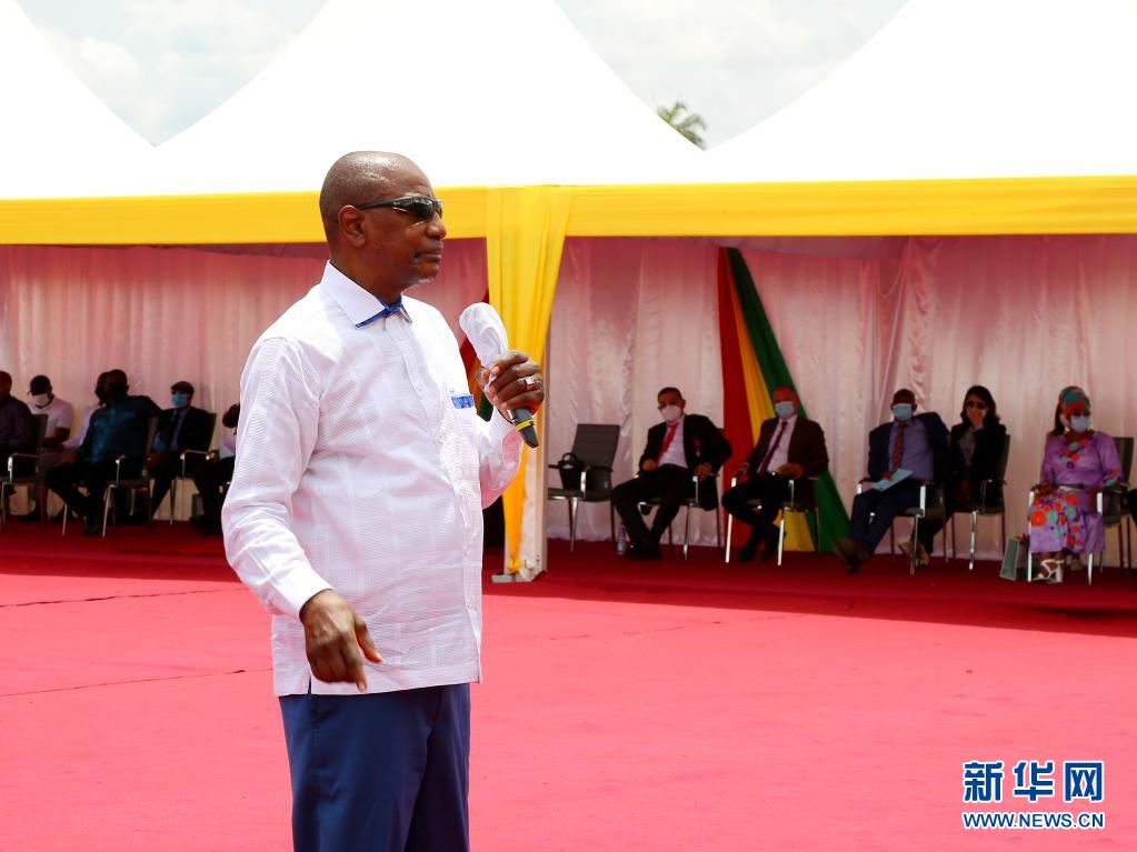 6月16日,几内亚总统孔戴(前)在达比隆港举行的通车仪式上致辞。新华社发