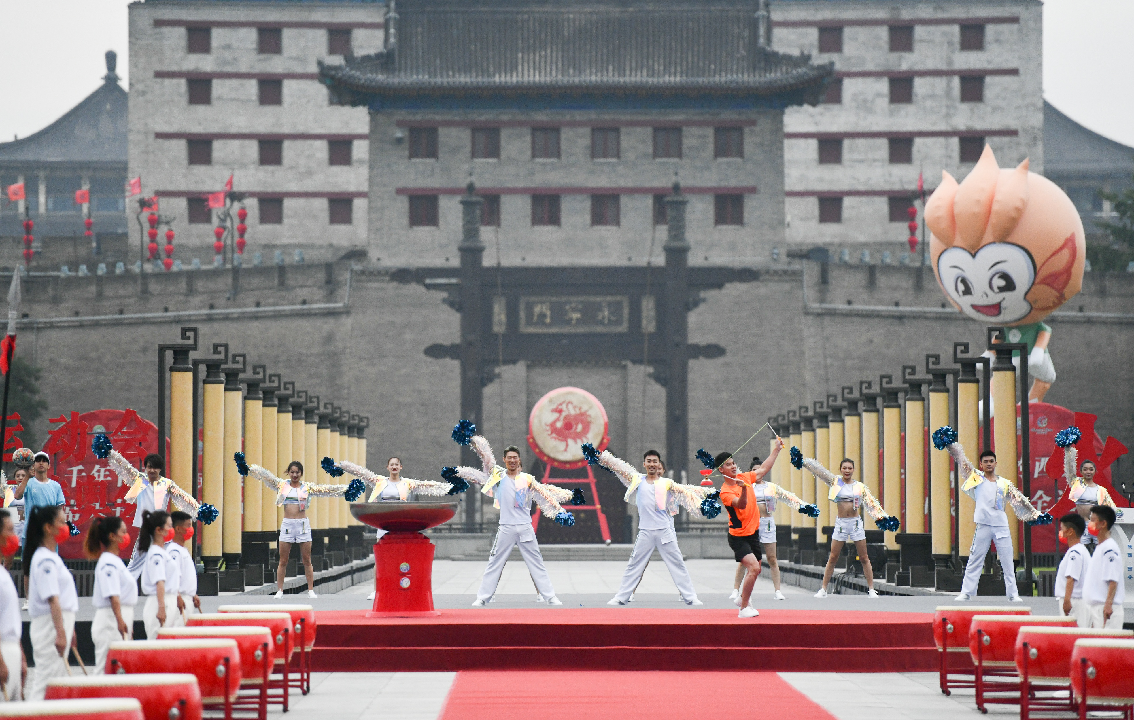 永宁门起火仪式现场简约热烈。暖场节目《奔跑的青春》中,30名身着各行业服饰的青春舞者,用自己的动人舞姿展示出了古城人民“服务十四运、奉献我的城”的殷殷之情。舞蹈《全民全运》将杂技、现代舞与啦啦操、花样跳绳、花式篮球、抖空竹等体育项目有机融合,充分展示出了全民全运的迷人风采。歌伴舞《党旗飘扬的地方》节奏明快,展现了中国少年的梦想与活力,表达了“恰是风华正茂,青春献给党”的豪情壮志,引得现场观众与演员们一同载歌载舞,精彩互动。