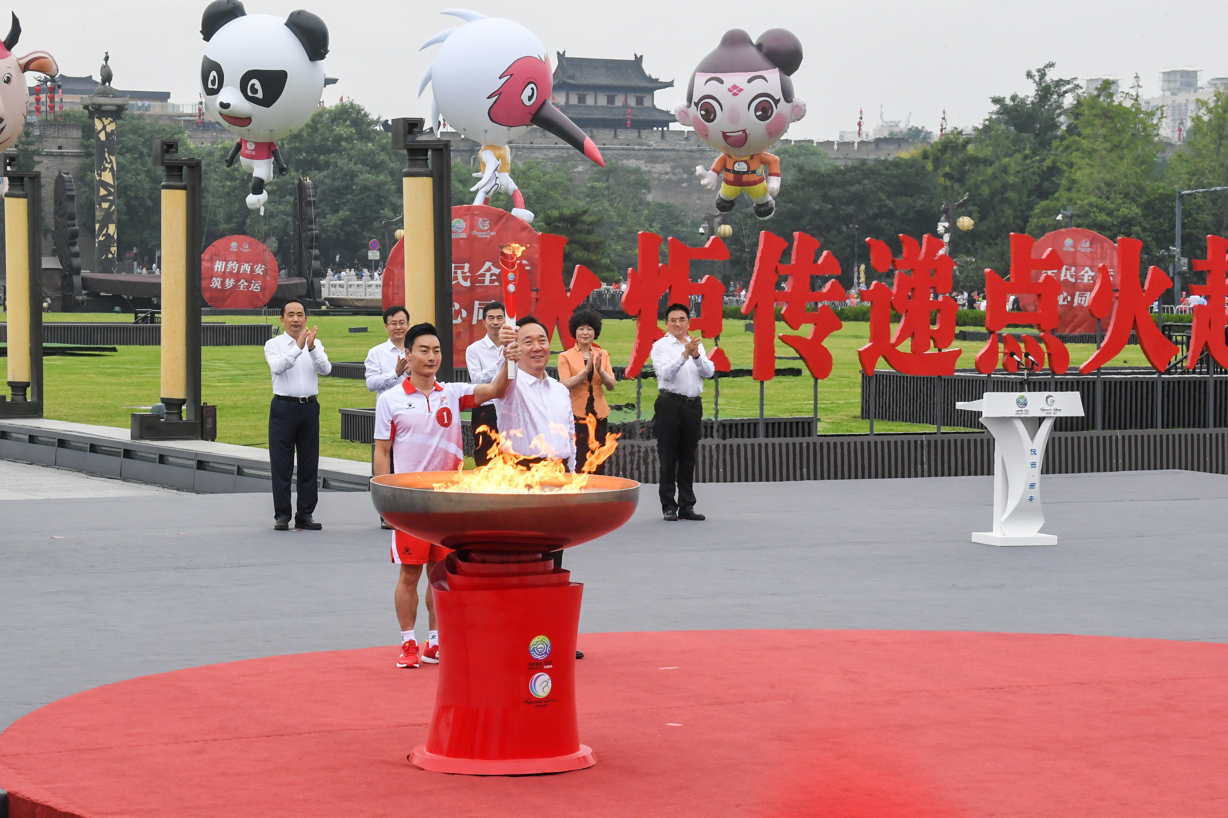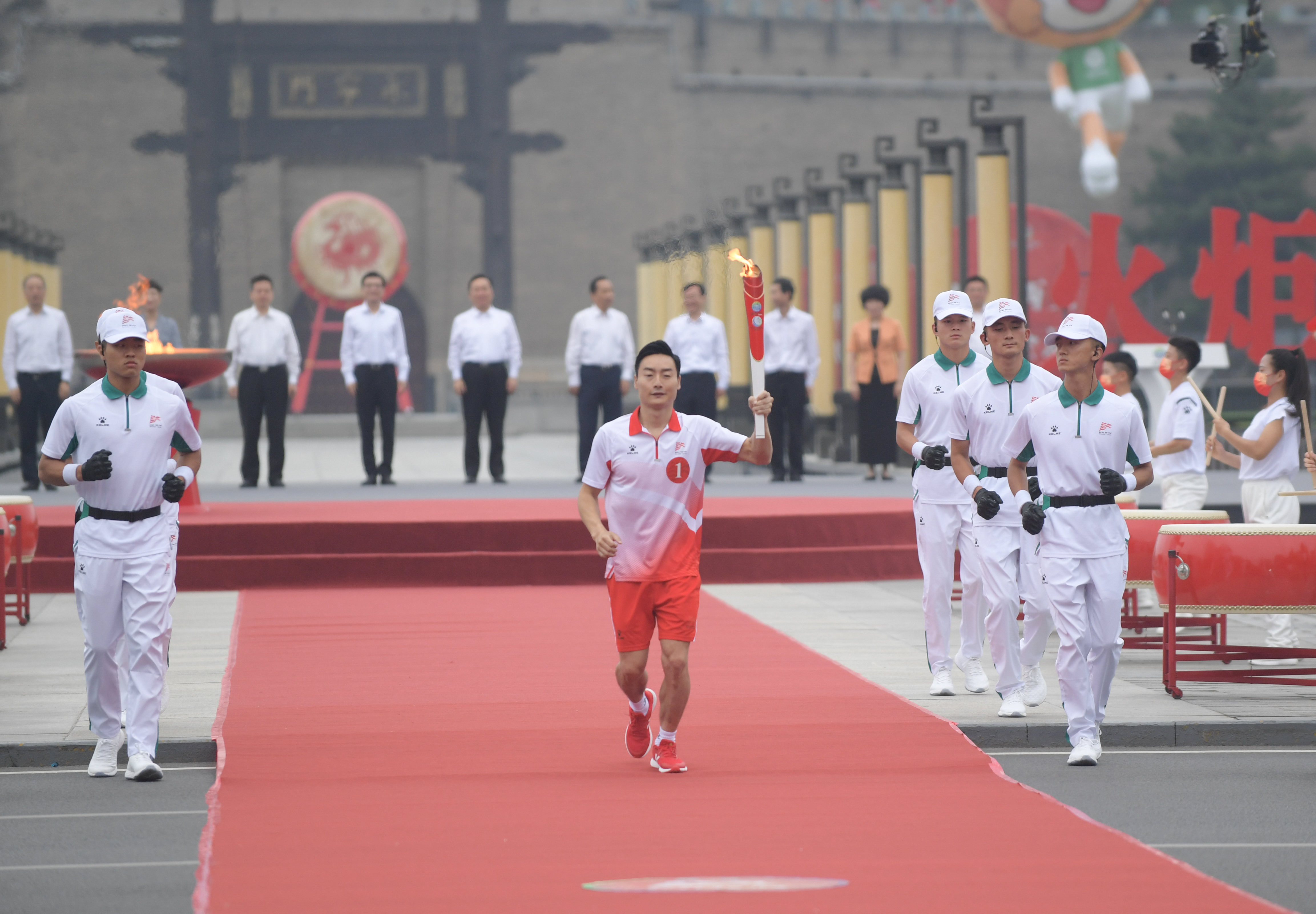 上午8点30分,火炬传递起跑仪式正式开始。在全场迎国旗,奏唱《中华人民共和国国歌》后,十四运会和残特奥会圣火在全场注目下被迎入仪式台圣火盆。奥运冠军秦凯有幸成为十四运会和残特奥会首站火炬传递的第一棒火炬手,在从省委常委、西安市委书记、十四运会组委会副主任、残特奥会组委会执行主任王浩手中接过火炬后,秦凯高举“旗帜”火炬,缓缓跑下仪式台,现场鼓声阵阵,激情飞扬,十四运会和残特奥会火炬传递正式开跑!