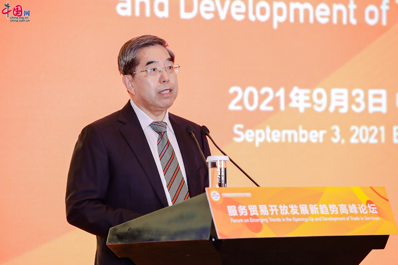 中国网/中国发展门户网讯 (记者王东海 殷晓霞)9月3日,2021年中国国际服务贸易交易会:服务贸易开放发展新趋势高峰论坛在北京召开。论坛以“开启服务贸易高质量发展新征程”为主题,围绕服务贸易高质量发展及新趋势等相关话题,紧扣数字化、绿色化、便利化等发展方向,开展系统深入的解读与对话。