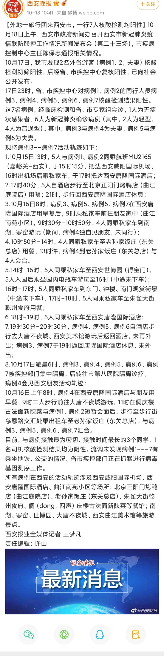 所有病例在西安的活动轨迹涉及西安咸阳国际机场、西安唐隆国际酒店、曲江南苑小区等场所;北京正阳门烤鸭店(曲江庭院店)、老孙家饭庄(东关总店)、朱雀大街乾州食府、侗(dong,四声)庆楼古法面新陕菜等餐馆;南湖、寒窑、世博园、大唐不夜城、西安曲江美术馆等旅游景点。