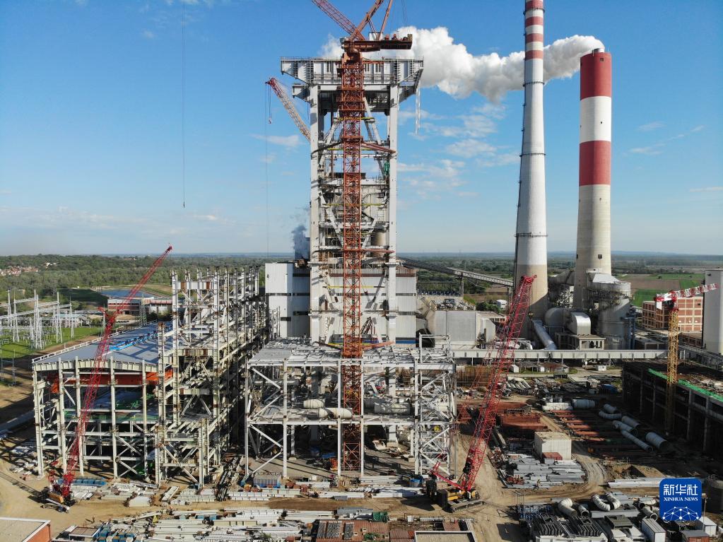 这是5月1日在塞尔维亚科斯托拉茨航拍的科斯托拉茨电站项目施工现场。