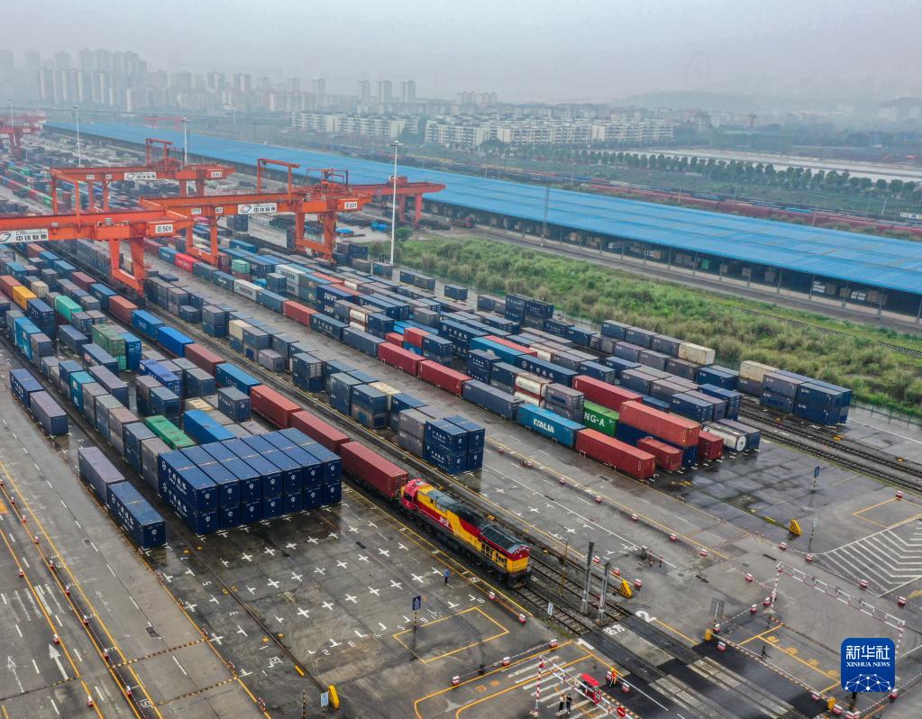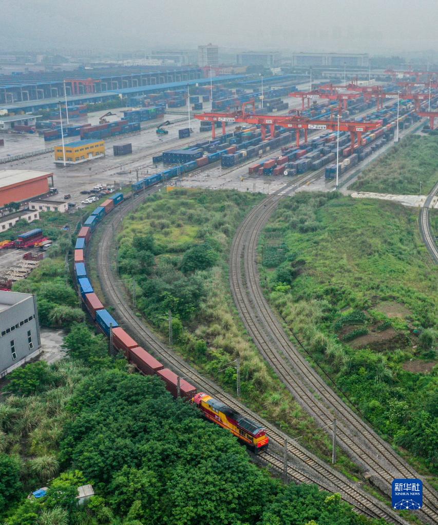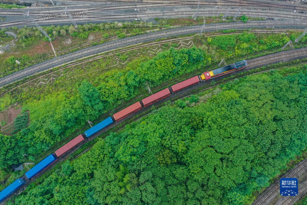 5月21日,全国首趟陆海新通道中老铁路“铁路快通”出境班列在重庆团结村中心站等候发车(无人机照片)。 新华社记者 唐奕 摄