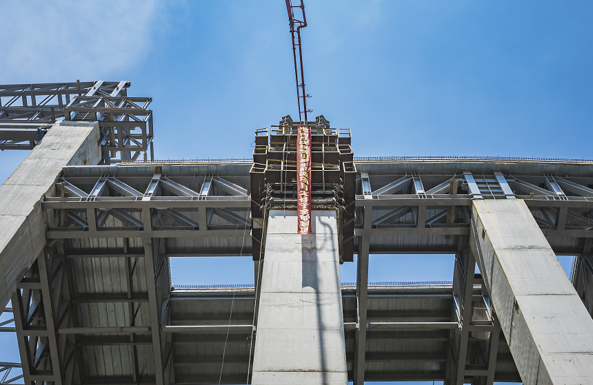 宝山再生能源利用中心项目是实行垃圾分类后上海首座开建的生活垃圾无害化处置设施,项目整体造型设计围绕“宝山有山”的概念出发,最高位置为60米,设置高空覆土景观结构,并由160余根3*3米的结构柱支撑起整个钢结构大屋盖及上部结构,每根结构柱平均高度约50米,采用钢骨柱外包钢筋混凝土结构形式,内部钢骨柱约1.3万吨。该工程结构柱施工体量大,且由于工期限制必须和其他土建、工艺设备安装等专业进行大量同步交叉作业,现场平面及空间复杂有限,同时由于结构柱大部分后期表面不做装饰装修,混凝土施工表面质量也至关重要。项目部多次召集专家团队展开专题会议,借鉴类似桥梁柱墩的施工工艺,通过对比分析传统木模、滑模、爬模、翻模等施工工艺并在现场做试验对比分析,最终决定以翻模和电动提模施工工艺作为本项目大屋盖结构柱的实体施工工艺。(张乐)